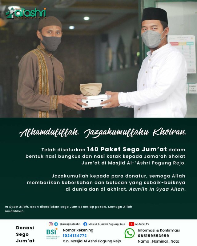 Masjid Al Ashri secara rutin, dengan izin Allah, memberikan nasi bungkus / nasi kotak kepada jamaah sholat jumat Masjid Al Ashri Pogung Rejo. Para muhsinin dapat memberikan bantuan, berupa makanan atau donasi yang dapat diberikan pada takmir atau melalui transfer ke bank BSI 1024134772 (kode Bank: 451) atas nama: Masjid Al Ashri Pogung Rejo, kemudian konfirmasi ke wa https://wa.me/6287820000731 (Admin | Hasan) Info ini akan diupdate lagi. insya Allah.