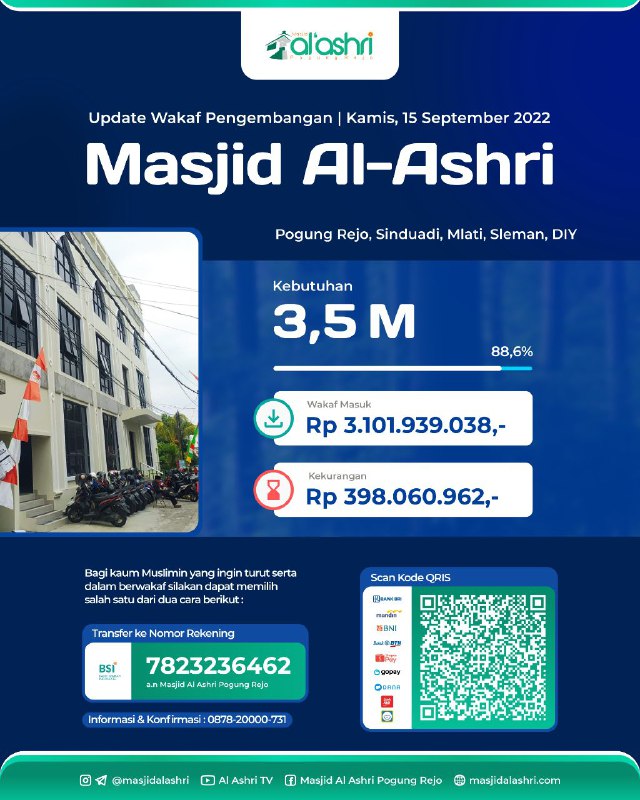 AYO WAKAF DI MASJID AL ASHRI POGUNG REJO Mari dukung perkembangan Masjid Al Ashri, Berikan infak terbaik Anda sebagai investasi akhirat. Saat ini Masjid Al Ashri sedang melaksanakan Pengembangan Masjid, dengan membangun gedung baru di sebelah timur gedung yang sudah ada. Alhamdulillah sekarang sudah memasuki tahap finishing, namun dana yang terkumpul masih belum mencukupi dari RAB. Wakaf dapat disalurkan melalui: E-Money dengan SCAN & PAY QRIS (barcode ada di gambar) Bank Syariah Indonesia (BSI) 7823236462 a.n. Masjid Al Ashri Pogung Rejo. Informasi & Konfirmasi : https://wa.me/6287820000731 (Admin Donasi) \*Sertakan bukti transfer.