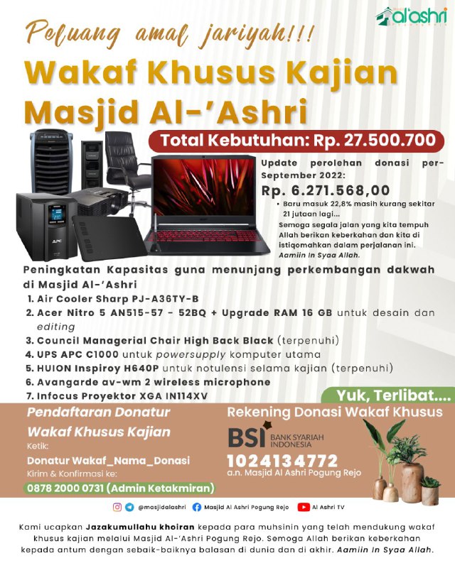 Yuk jamaah menjadi bagian dari Wakaf Khusus Kajian di Masjid Al Ashri Pogung Rejo. Alhamdulillah kini Masjid Al Ashri Pogung Rejo mulai mempersiapkan dan memperbaiki diri dalam menyebarkan dakwah sesuai al-Qur'an dan as-Sunnah melalui upgrade khusus kajian. Semoga segala jalan yang kita tempuh Allah berikan keberkahan dan keistiqomahan.